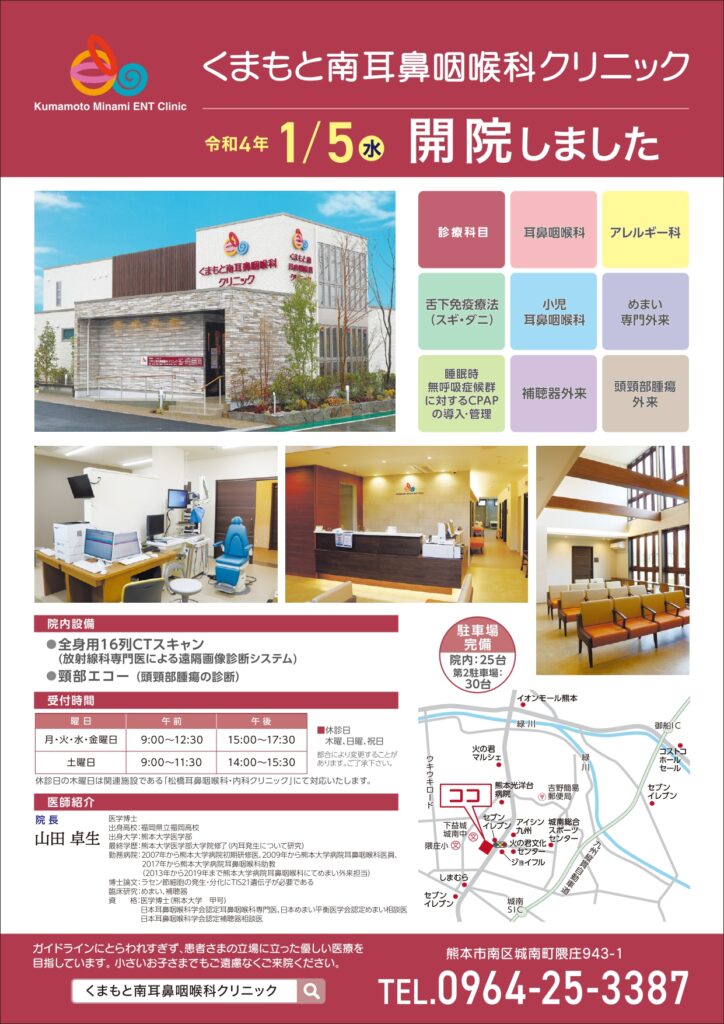 当医療法人社団は、令和4年1月1日に熊本市南区隈庄に「くまもと南耳鼻咽喉科クリニック」を開設しました。熊本県央の耳鼻咽喉科診療を担えるように従事していきたいと考えております。よろしくお願いいたします。診療は令和4年1月5日から開始しております。木曜日、日曜日は休診です。詳細は電話番号:0964-25-3387へお願いいたします。
