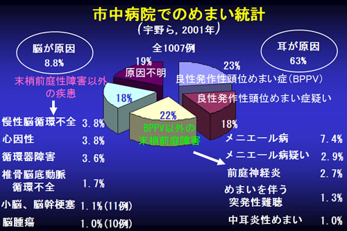 図に示しますように2001年の宇野ら(吹田市民病院)の報告によると市中病院において、めまいの原因の約60%は耳が原因となっております。