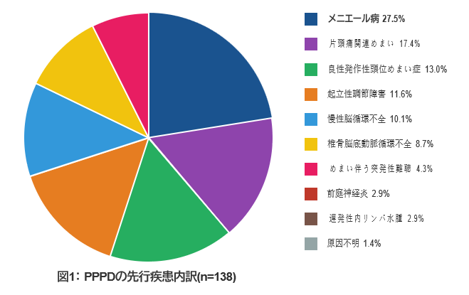 当院でPPPDと診断され治療を行った138例(平均年齢53.3歳)のデータです。PPPDは他のめまい疾患が引き金(先行疾患)となることがほとんどです。